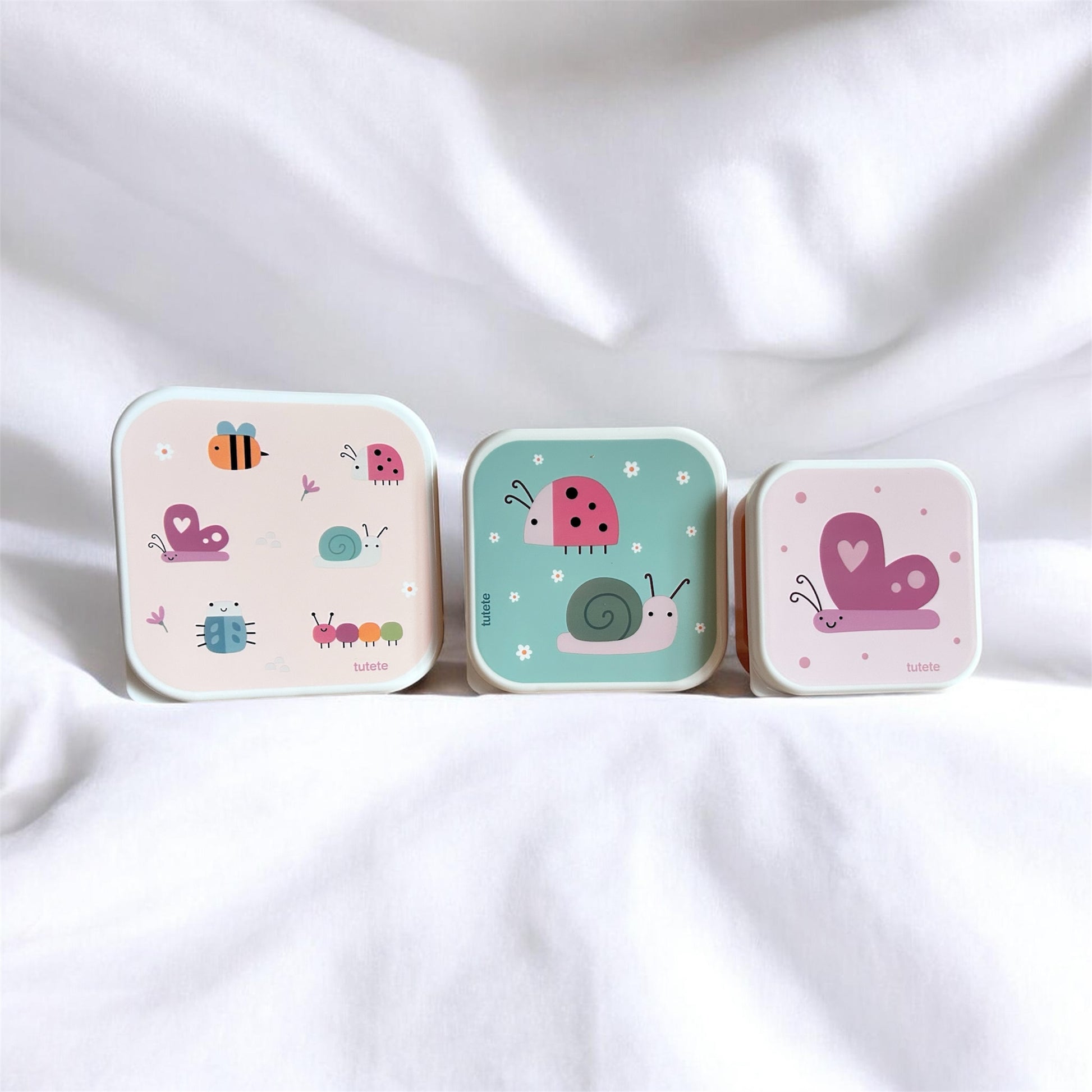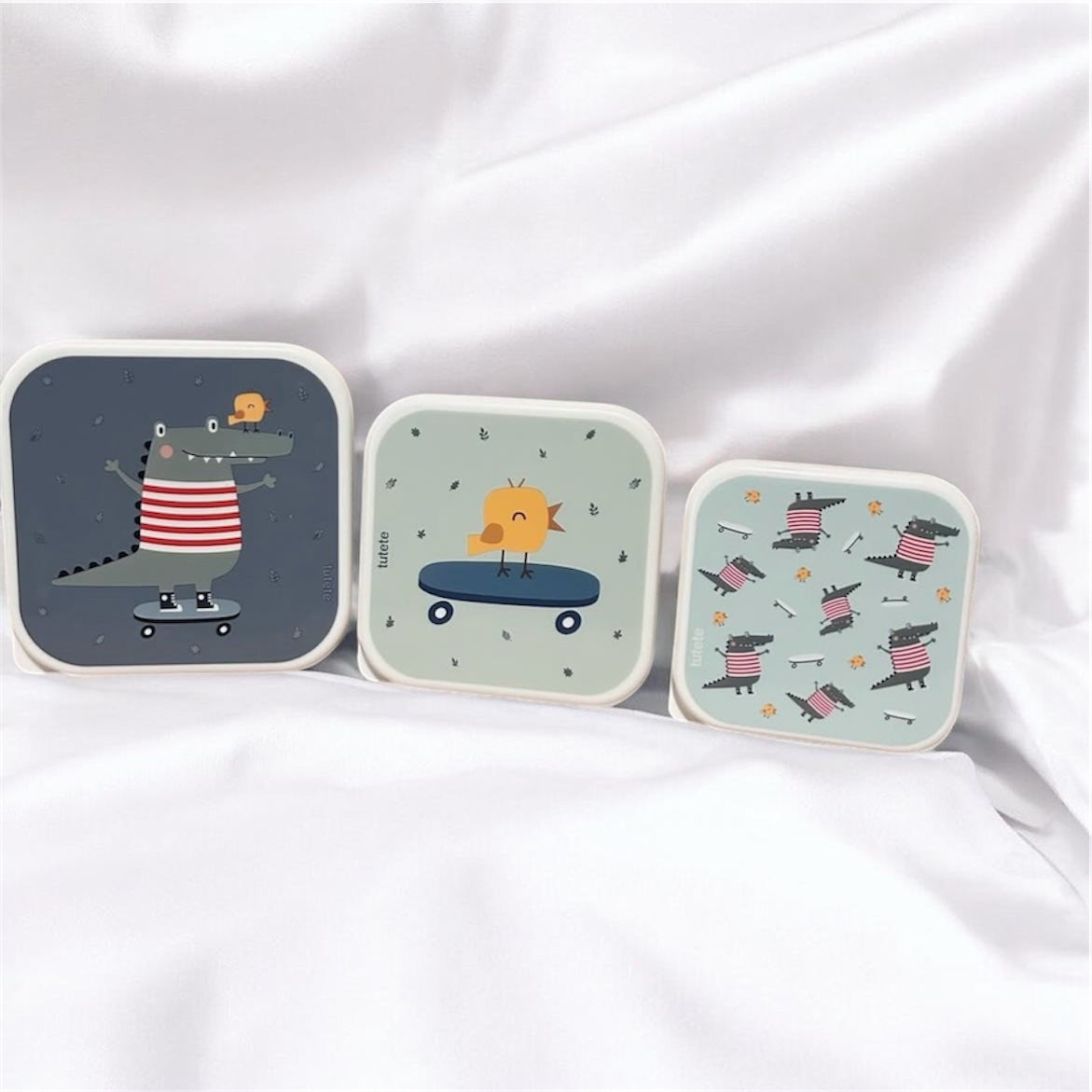 Ensemble de 3 boites à lunch avec des motifs exclusifs, parfaites pour transporter différents aliments séparément à l’école.